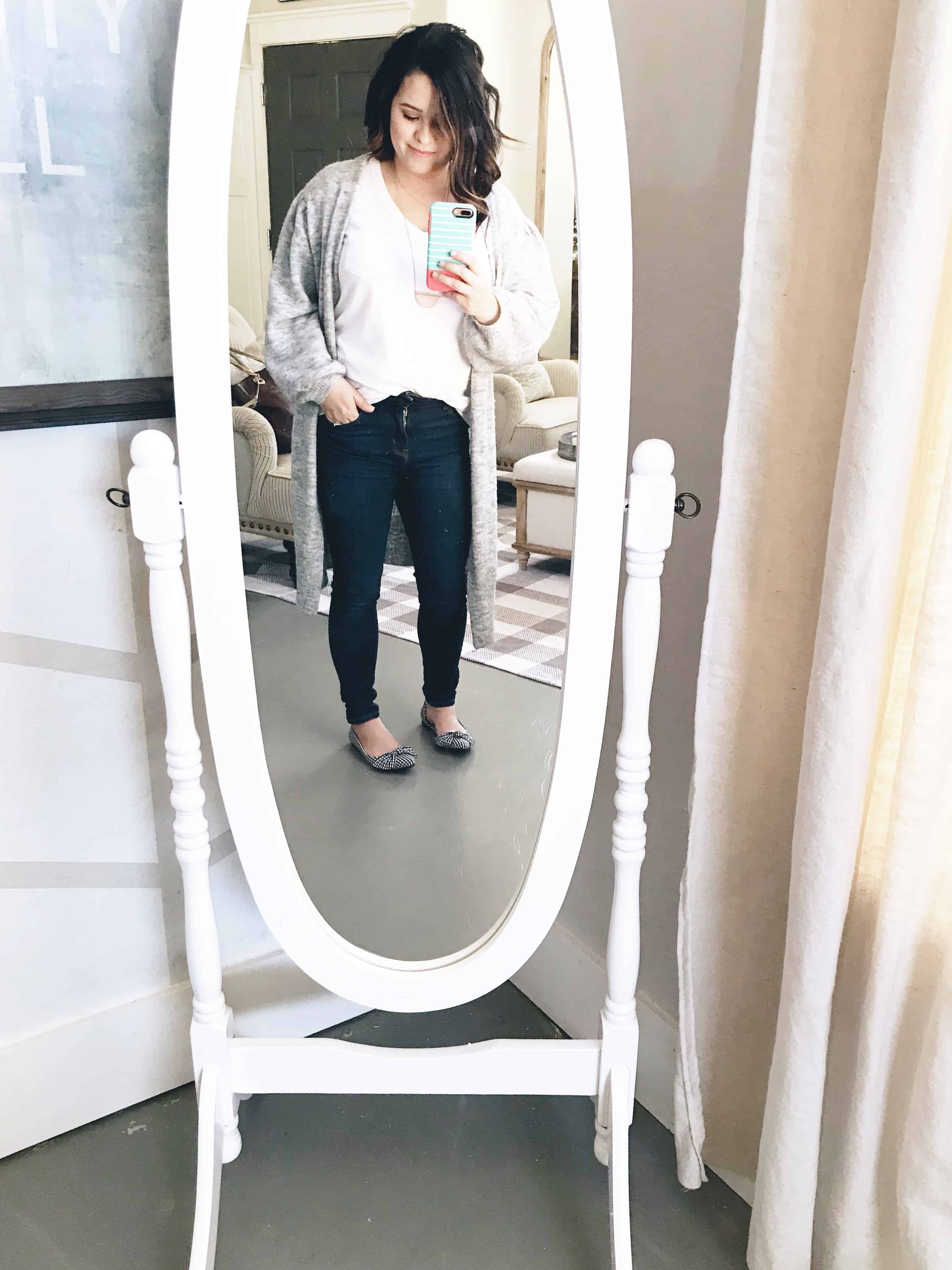 Well, you all voted on Instagram to see more of what I wear… so here goes nothing. Outfit of the Day post Take 1. Ready or not… here it is. I love a good put together outfit that I can easily wear to a couple client meetings, and then transition seamlessly to my mothering duties. I pretty much loathe being uncomfortable or feeling like I need to change all day. My recipe for looking semi professional but still comfortable is usually this: dark well fitting denim, a tee, cardigan with personality, and a cute shoe. These skinnies have like some kind of magic in them and are sculpting. They keep everything in, like everything… not just in but also flat and what I looked like in my abdominal area pre-kids. I call that a win! They are only $37 and literally a staple of my closet.