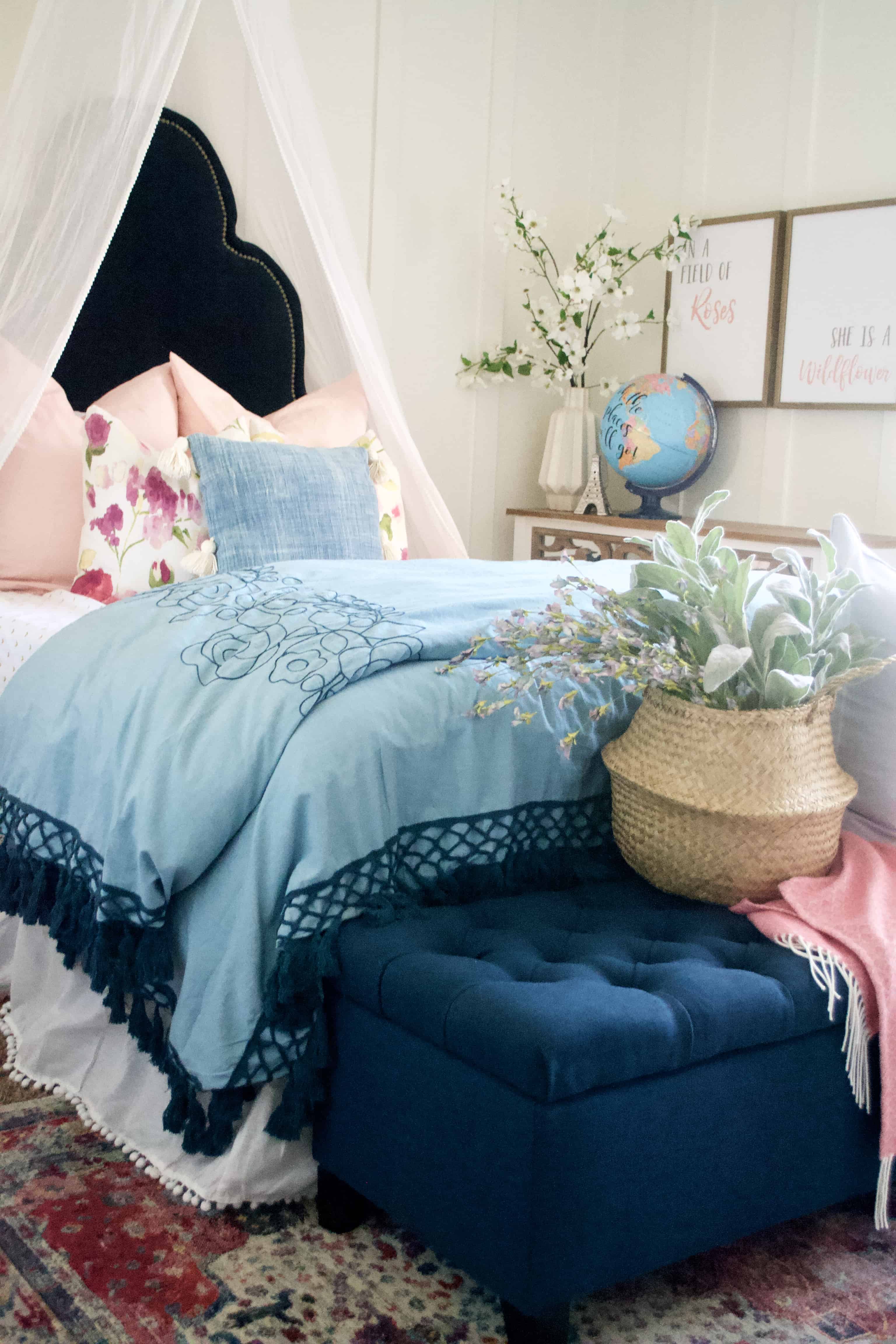 A couple of the bed options I listed I was SUPER close to ordering because I wasn’t sure my DIY project would turn out the way I envisioned. Is it bad to admit that I doubt my DIY projects until nearly the very end every single time. A lot of the bedding I used is still available, however the duvet has been discontinued from Pottery Barn Teen, but they just started making a really similar chambray duvet that I just love too! Ps- The bedskirt I used is one of my very favorite things!