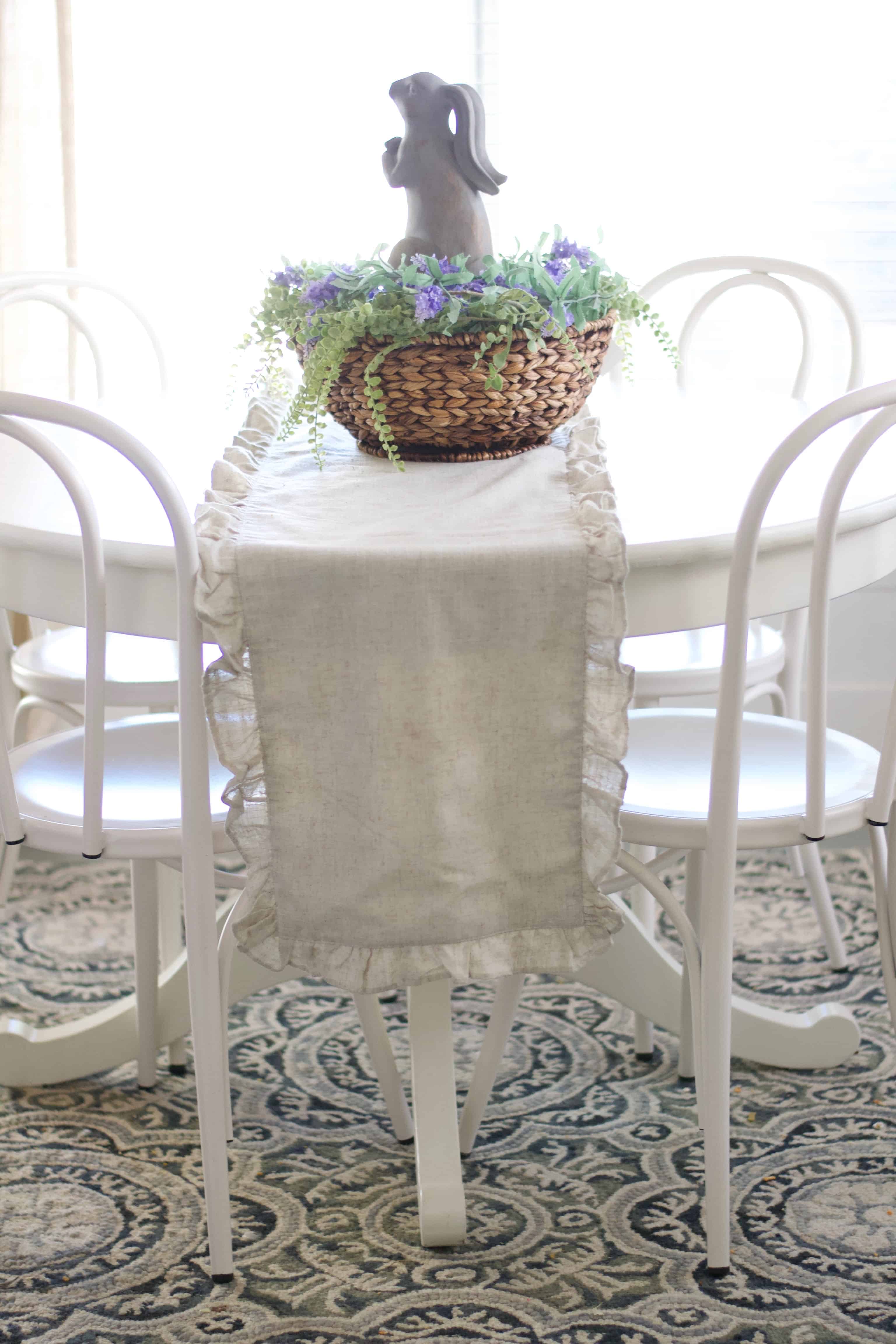 The linen table runner is a Homegoods find also. I got mine a while ago but I see them there often but you can also get them online with companies like iQ Linens if you didn’t want to venture out to the shops. I love the linen fabric and the pretty ruffles. It just adds a pretty layer of interest without being too much, this runner lives on my table 85% of the year because it’s just so good.