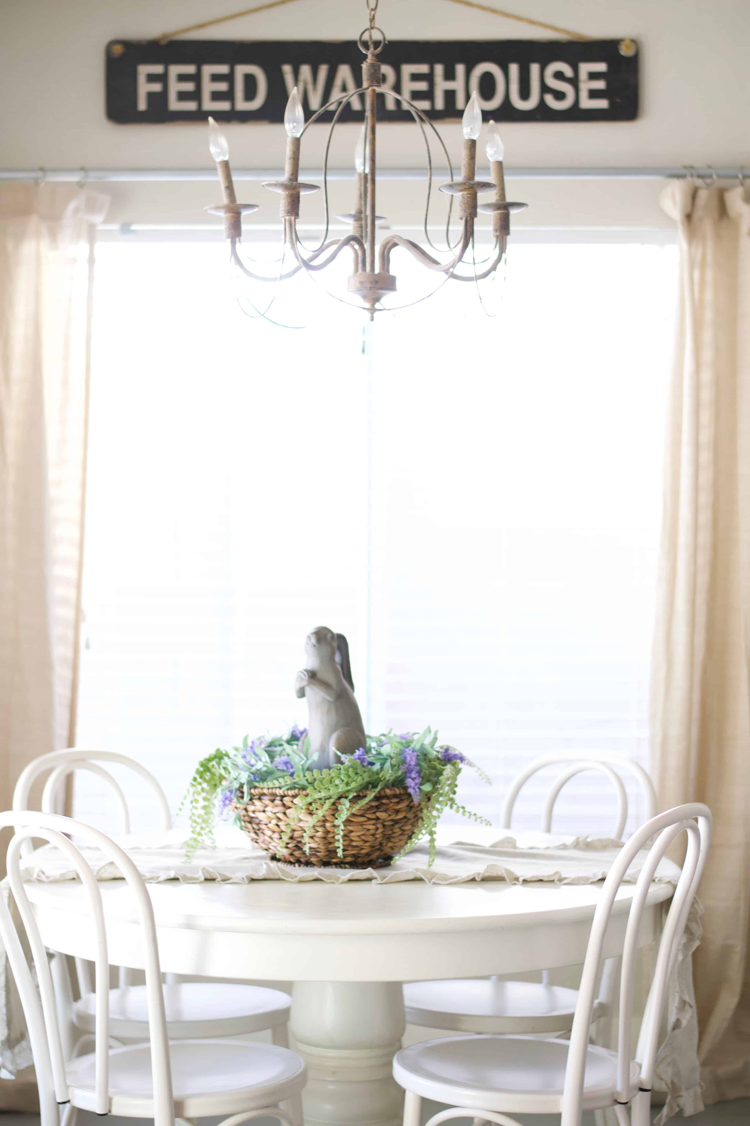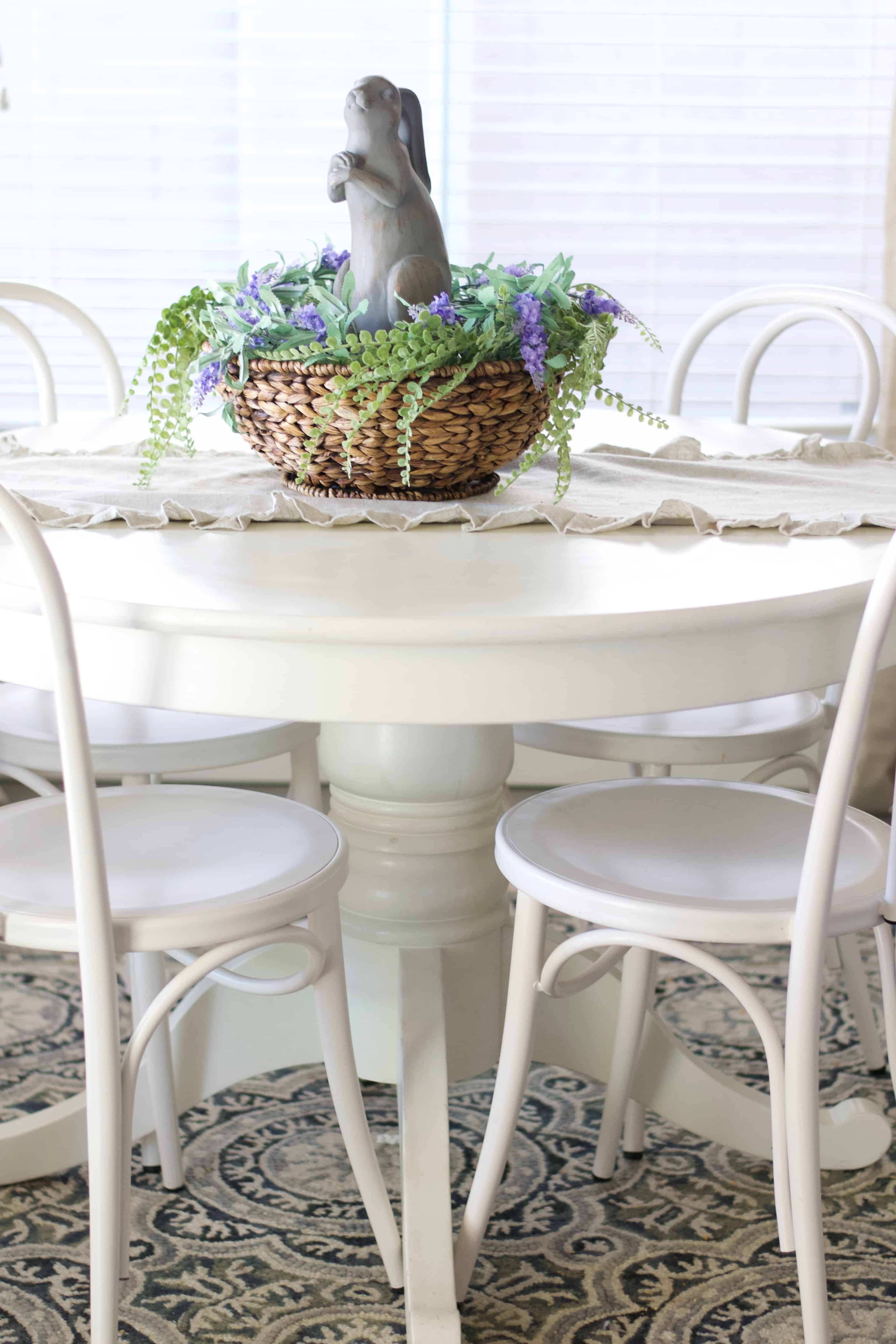 The grey bunny & wicker bowl are from Hobby Lobby. The lavender faux florals is actually a garland wrapped in a couple circles from Michael’s, and the greenery is also from Michael’s. The bunny is propped up inside with an upside down bowl. I would show you our place settings, but who am I kidding? We’ll be dining on paper plates, because I loathe dishes. I feel like showing perfectly set places would make me a fraud.