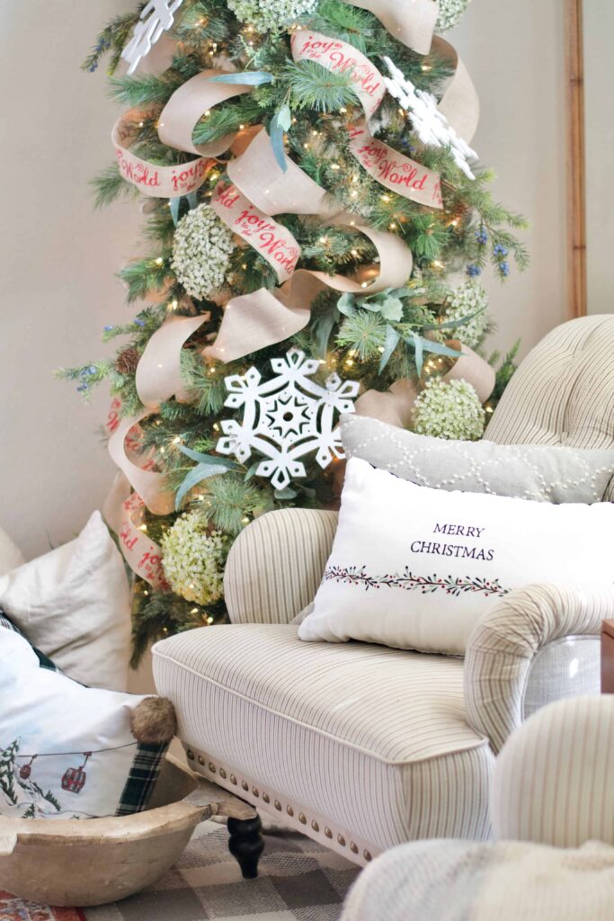 Last, my Joy to the World ribbon was tucked in. I worked in smaller 4′ pieces of this and just wove it here and there. Once I added the star I was done.