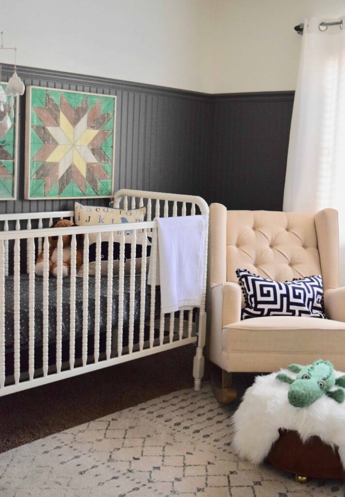 I would contend that the best part of having a baby is getting to design a Nursery for them because there’s such little rules when it comes to baby rooms… you can pretty much do whatever your heart desires. Which is definitely what I did when I was designing this space. We live in a tract home with teeny bedrooms, but I really wanted to do something different to the walls in this space. Every designer will tell you not to paint tiny spaces dark colors… its like rule numero uno. But hey, its a baby room so why not!