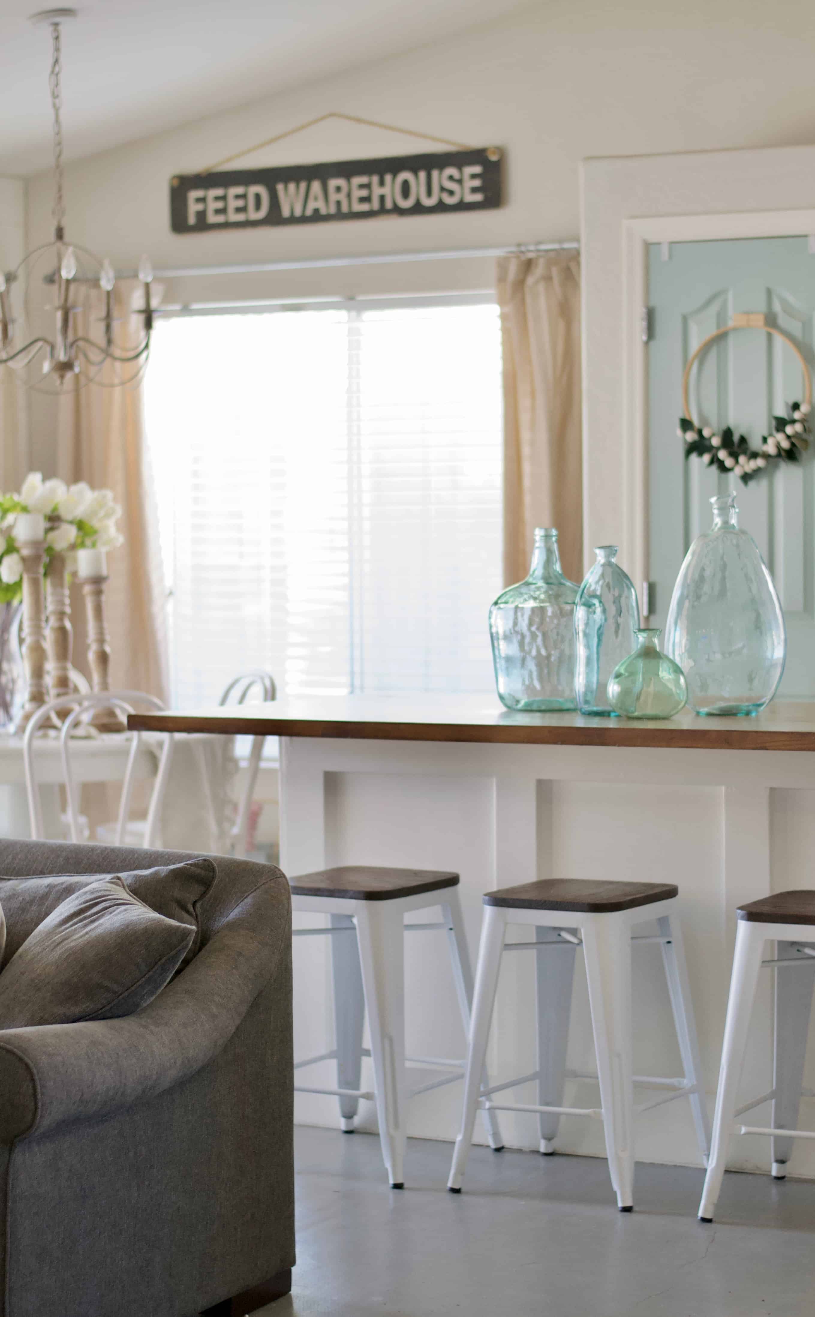 We removed the laminate counters, and painted over the distressed painted cabinets. We added a simple crisp subway tile backsplash, but probably my very favorite thing we did was frame out the window above the sink adding a window sill, and the open shelving on both sides of the window. We also swapped out the builder grade sink for this white Ikea farmhouse sink. The butcher block counter tops are also Ikea, I stained and sealed them to make them water proof. We added some craftsman style moulding detail to our island. I painted the cabinets with a chalk paint mixture. I used BB Frosch chalk paint add in, to my favorite Benjamin Moore Swiss Coffee white paint. The chalk paint mixture made it so little prep was needed before painting. It really really simplified the process.