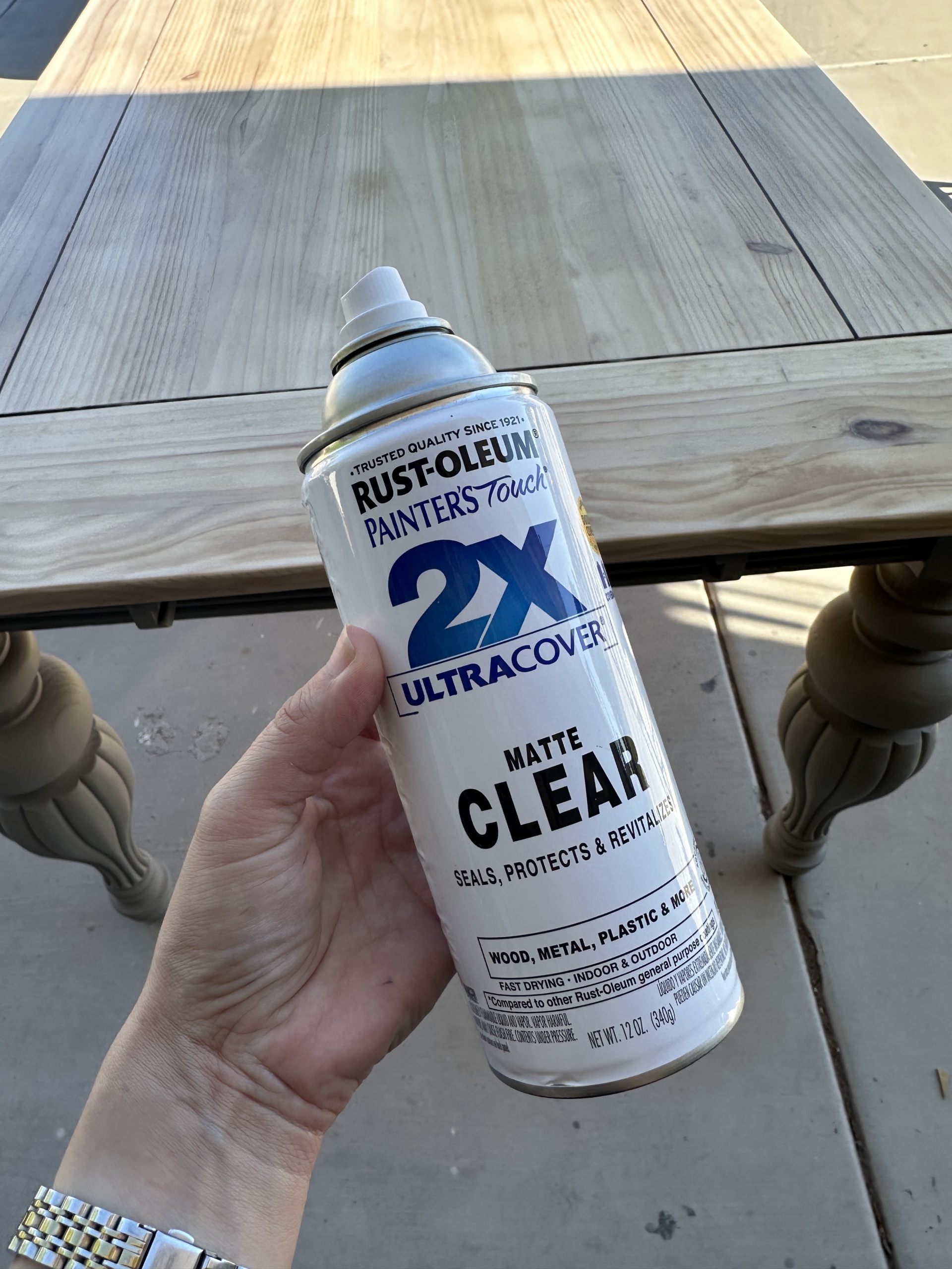 On the main table to strip off the old finish, I tried out the Oven Cleaner Method. It worked pretty well. I did a lot of research and everyone seemed to recommend using the name brand cleaner and that this version worked the best. It took me two coats on the dining table and about 6 cans. This method does not always work so test it out on a small section before you buy a bunch of cans. It worked great on the table but not very good on the chairs