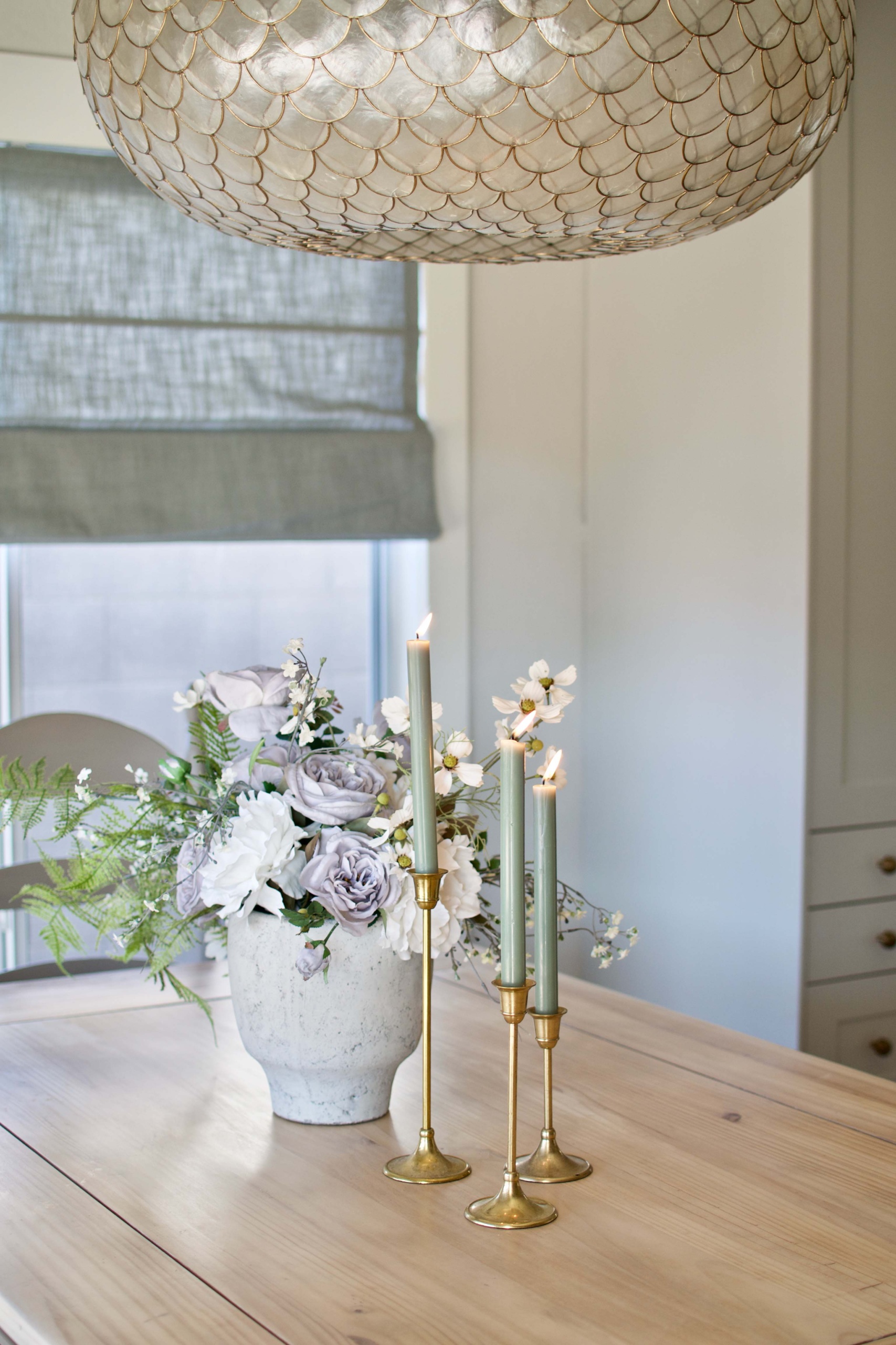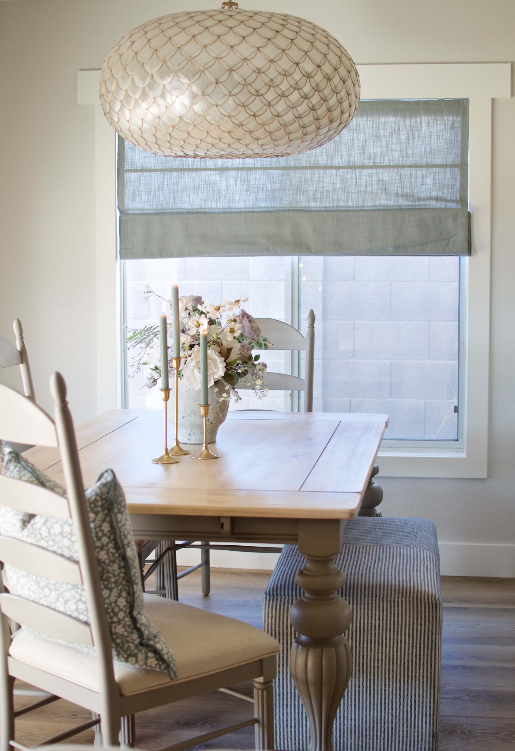 For the table skirt & chairs I tried out Mineral Paint for the first time. I went with the shade “algonquin”. It is a pretty putty-grey color. One container that size finished 4 chairs and the table skirt for me, I was very surprised at how far it went. I did do a light sanding between coats to get a smooth finish. To seal the painted areas, I used this matte clear coat I picked up at Home Depot. It worked great.